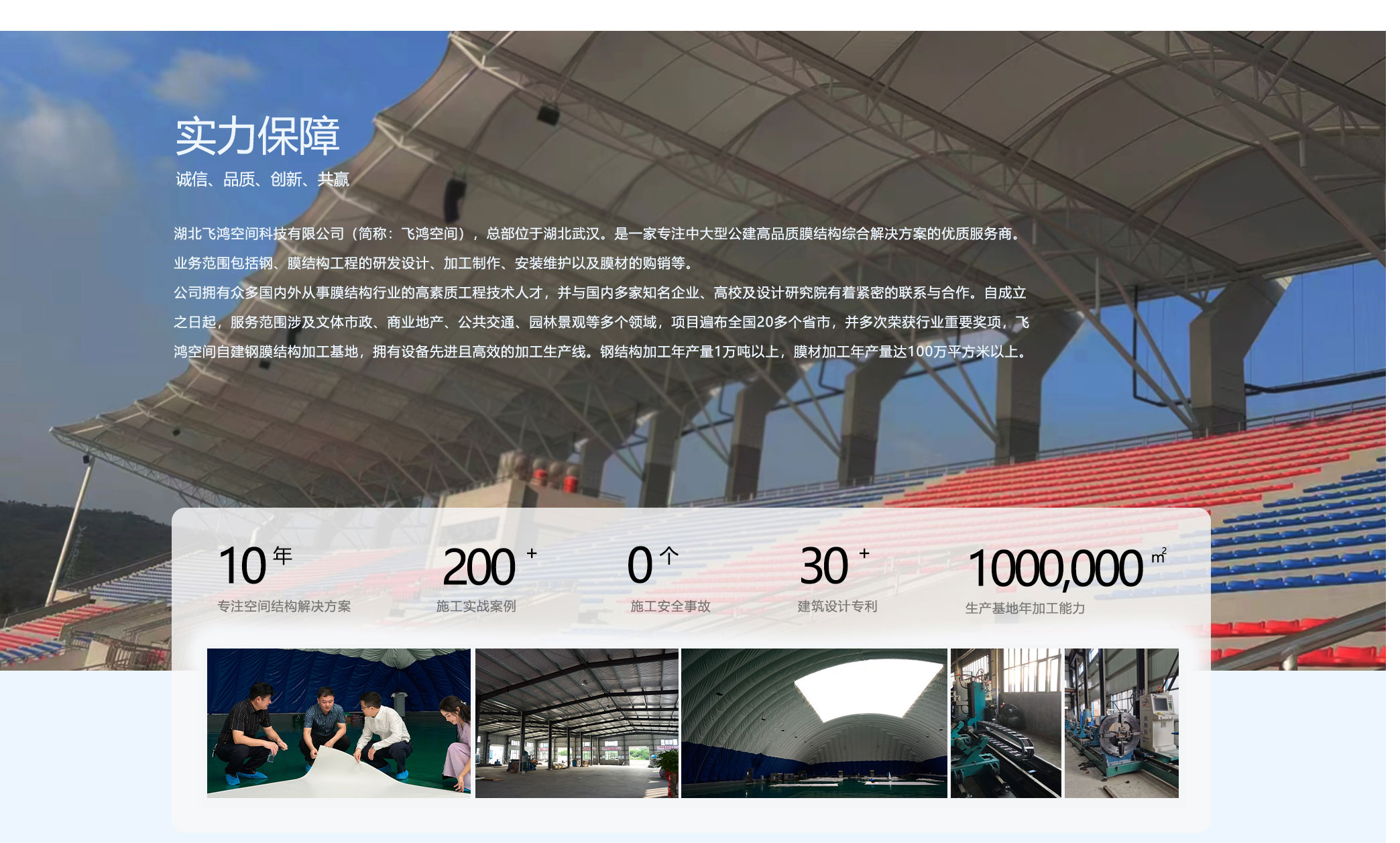 湖北飞鸿空间科技有限公司(简称:飞鸿空间),总部位于湖北武汉。是一家专注中大型公建高品质膜结构综合解决方案的优质服务商。业务范围包括钢、膜结构工程的研发设计、加工制作、安装维护以及膜材的购销等。公司拥有众多国内外从事膜结构行业的高素质工程技术人才,并与国内多家知名企业、高校及设计研究院有着紧密的联系与合作。自成立之日起,服务范围涉及文体市政、商业地产、公共交通、园林景观等多个领域,项目遍布全国20···